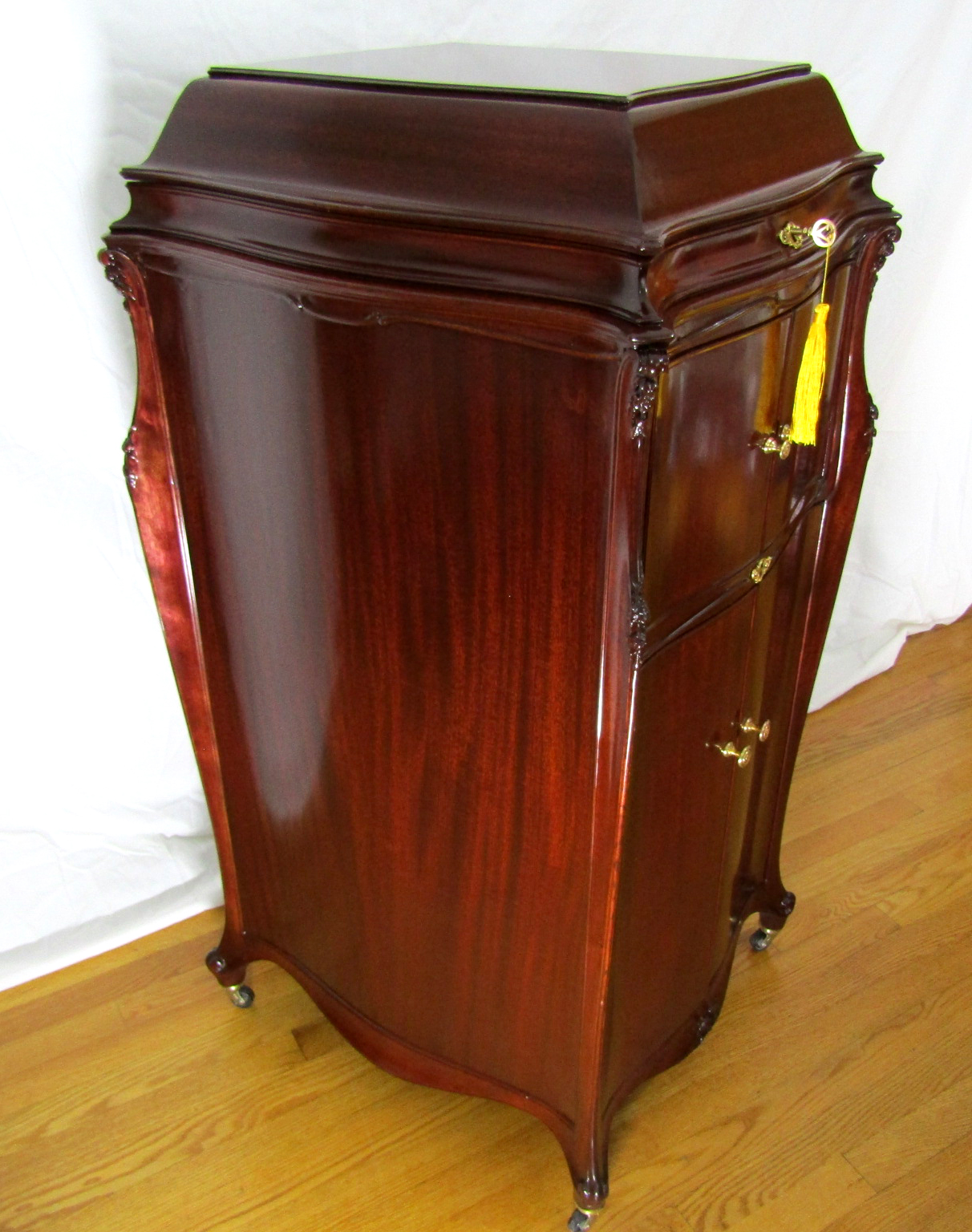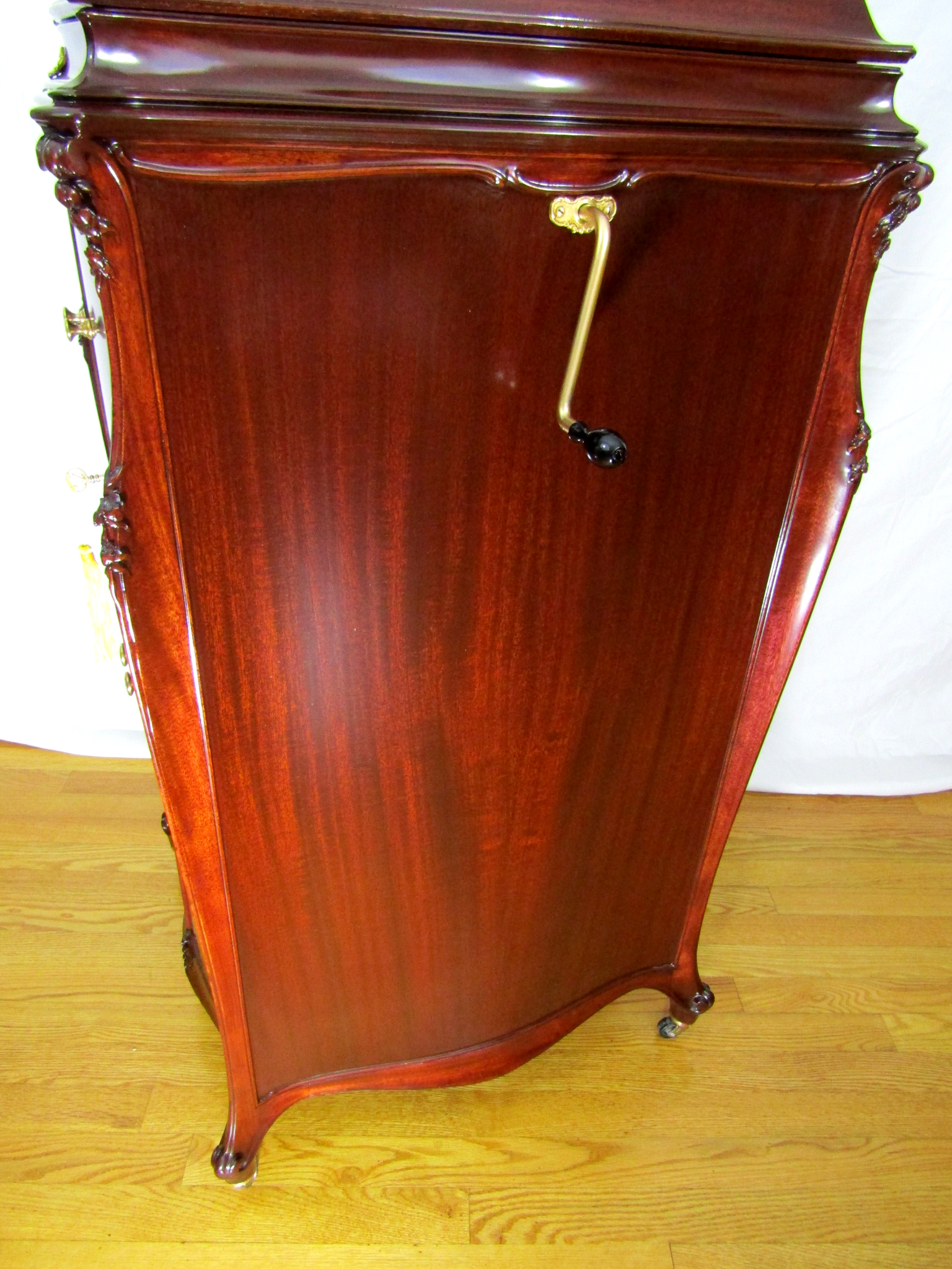 Introduced in the fall of 1916 and was an elegant and impressive machine with its bombe’ style curved cabinet, nicely carved corner posts and figured brown or red mahogany. The base price of the XVII was set at $250.00, which equates to almost $5,332.09 in today’s money.